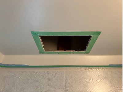 浴室換気扇から浴室暖房乾燥機の交換では、開口寸法がことなるため、新しい機器にあわせて開口部分を広げて設置します。