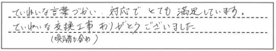 ていねいな言葉づかい、対応でとても満足しています、ていねいな交換工事(換気扇も含め)ありがとうございました。