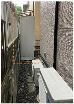 その上に薄型エコキュートを設置します。奧行が68cmの角型タイプに比べて薄型タイプは44cm。隣接する障害物との距離が約60mあれば設置することができます。
