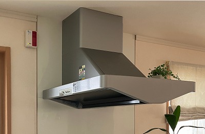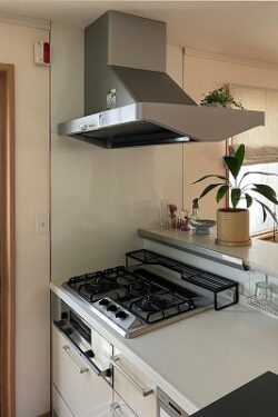 既設のレンジフードはオープンキッチンで使用されることが多い横壁に設置されてある少し珍しいサイドフード。