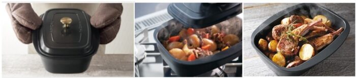 専用容器の一つ目は深型鍋のザ・ココット。コンロでもグリルでも使える万能鍋で、煮物からグリル料理・蒸し料理も、こちらの鍋一つで調理可能。オートメニューがついているため、具材と調味料を入れてあとはボタン一つで簡単に調理ができます。