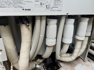 配管カバー内の配管の様子です。凍結防止用の保温筒もしっかりと巻き、冬に備えます。
