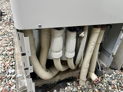 配管カバー内の様子です。冬場の凍結防止用に保温筒もしっかりと巻かせていただいております。