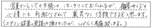 営業マンとしての主張ははっきりしておられるが、顧客サイドの心情にも気配りされて裏表なく信頼できる方と思います。
