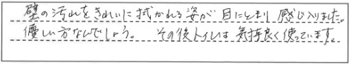 壁の汚れをきれいに拭かれる姿が目に止まり感じ入りました。優しい方なんでしょう。その後トイレは気持ち良く使っています。