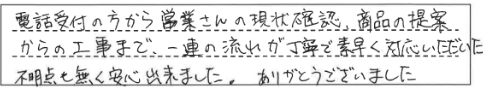 電話受付の方から営業さんの現状確認、商品の提案からの工事まで一連の流れが丁寧で素早く対応いただいた。不明点も無く安心出来ました。ありがとうございました。