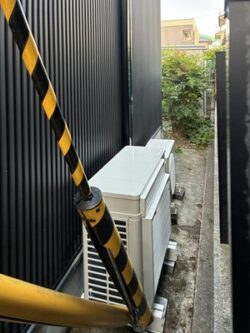 室外機の設置場所に勾配があったため架台(プラロック)の下にブロックを配置し、機器が水平になるよう高さを調整しました。