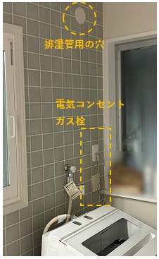 お客様のお宅には、乾太くんを設置時に必要な排湿管用の穴・電気コンセント・ガス栓があらかじめ備え付けられていたため、本体の設置工事のみおこないました。