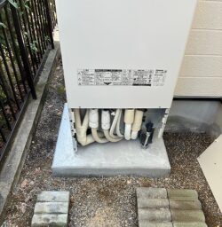 こちらの場所に新しくベースを作成します。ベースが乾燥し新しいエコキュートを設置するまでの間は、仮設のガス給湯器を設置させていただき、お湯が使えるように対応させていただいております。