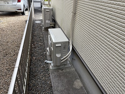 2階のお部屋から1階の室外機までの配管はお客様のご希望でテープ巻きに。梯子を立てるスペースがなかったため、お隣様の敷地から梯子を立てておこないました。