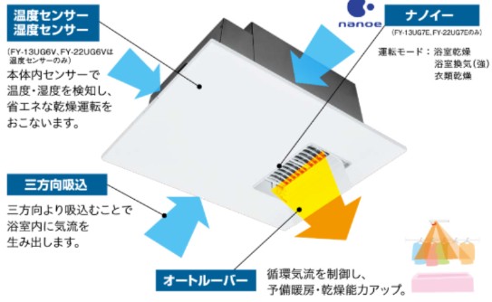 「エコナビ」&「ナノイー」搭載で、乾燥時も省エネ。浴室乾燥・浴室換気・衣類乾燥時には、「ナノイー」を浴室に放出し、浮遊カビ🦠を抑制してくれます。