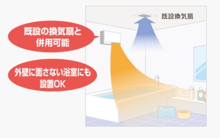 こちらの商品は、今までの換気扇と併用でき、浴室を開口することなく簡単に取付けが可能です。
