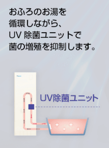 ダイキンのXシリーズに搭載されている除菌機能「おゆぴかUV」。 UV(紫外線)でお風呂のお湯を除菌し、保温中の菌の増殖を抑制します。