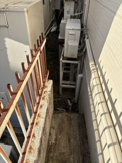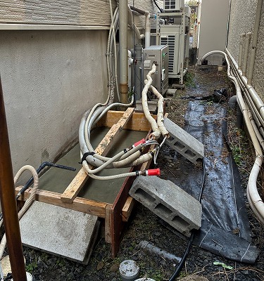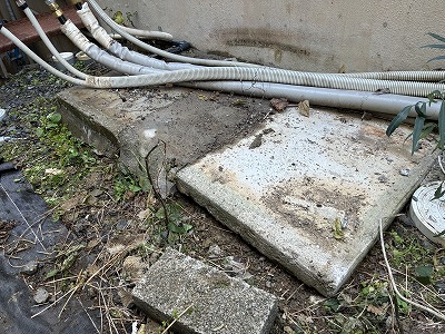 既設のエコキュートを支えるベースは、厚みが薄くグラグラと不安定な状態でした。こちらのベースへ設置するには危険ですので、新しくベースを作成します。