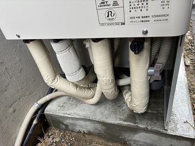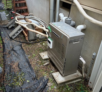 ベースが乾燥し新しいエコキュートを設置するまでの数日間は、仮設のガス給湯器を設置させていただき、お湯が使えるように対応させていただいております。