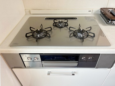 75cmタイプのコンロを交換しました。天板のデザインや操作部分が大きく変わり、見た目もスッキリとスタイリッシュになりました。