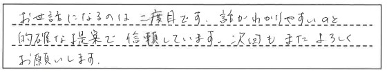 お世話になるのは二度目です。話がわかりやすいのと、的確な提案で信頼しています。次回もまたよろしくお願いします。