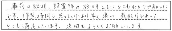 事前の説明、設置後の説明ともにとてもわかりやすかったです。作業時間も思ってたより早く済み、気配りもあってとても満足しています。次回もよろしくお願いします。