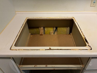 既設のIHを取り外すと、今までお掃除のできなかった隙間の汚れがでてきますが…
