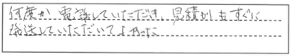 何度か電話していただき、見積もりもすぐに発送していただいてよかった。