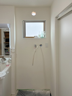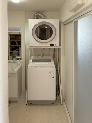 設置場所は、洗面所の洗濯機上スペース。専用架台を使用して設置しました。 また、既設のパイプファン(換気扇)を撤去し、その開口部を利用して排湿管を通しています。