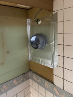 プロペラファンを撤去し、シロッコファン用のダクトを施工します。シロッコファンはダクトを通って排気します。