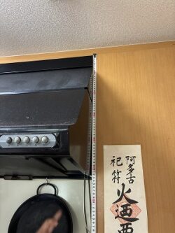 まずは、事前に現地調査をおこない、採寸、排気口の確認などをおこないます。吊戸棚の奥行が35cmでレンジフードの面が少し前に出ることをあらかじめお伝えし、ご了承いただいたからご契約いただいております。
