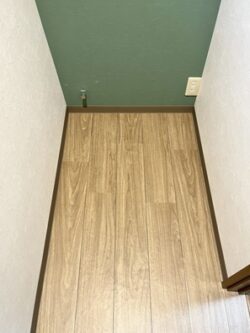 深緑のアクセントクロスに温かみのある木目調クッションフロアで、落ち着いたナチュラルな空間になりました。