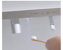 ボタンを押すと「きれい除菌水」がふきかけられ、歯ブラシや排水口の汚れ・菌を抑えます。