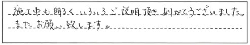 施工中も明るくいろいろご説明頂きありがとうございました。また、お願い致します。