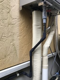 下記写真の給湯器本体から出ている黒い管がドレン排水用の配管です。