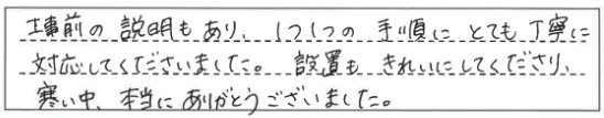 工事前の説明もあり、1つ1つの手順にとても丁寧に対応してくださいました。設置もきれいにしてくださり、寒い中、本当にありがとうごさいました。