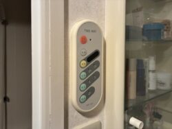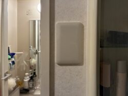 リモコンサイズが大きくなるため既設の位置に設置できないため、お客様とご相談の上位置を変更しています。元のリモコン位置には目隠しプレートでカバー。