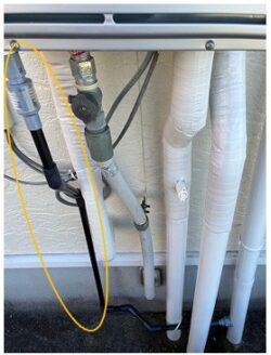 左の黒い配管がドレン配管です。ドレン配管は、雨樋に流れるように接続しています。