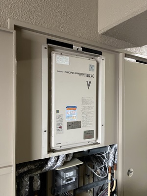 草津市の分譲マンションにお住まいのお客様よりご依頼いただき、高温差し湯タイプのガス給湯器の交換工事を行いました。